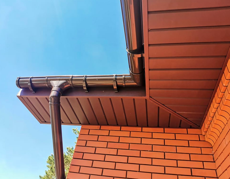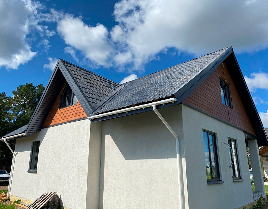 - Обязательный подшив свесов, монтаж водостока, снегозадержателей, дымохода;